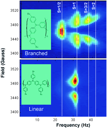 The figure shows the spectrum corresponding to a branched polymer exhibiting several different spin states: non-coupled spins (S=1/2), but also higher spin states showing that a noticeable fraction of electrons are coupled by pairs (S=1), by 3 (S=3/2) and by 4 (S=2). The second spectrum, corresponding to a linear polymer is very different: all of the electrons are coupled but only two by two (S=1). It is thus possible to better understand the magnetic interactions that occur in the polymer and to propose novel structures in order to visualize higher spin states.