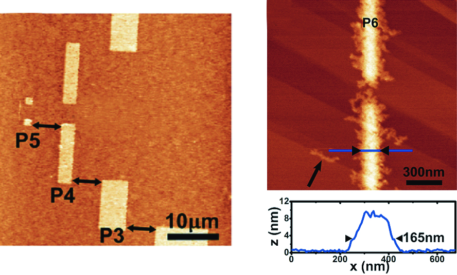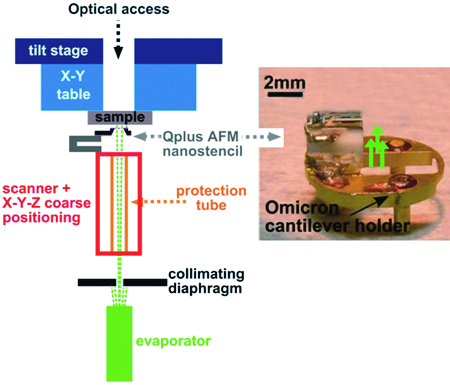 Performance We have experimentally demonstrated that, despite the addition of a massive chip on the fork, high-resolution imaging (about 10 nm) is possible on a wide range of samples, including soft materials. Spectroscopic measurements show that the AFM control processes are fully efficient. The AFM tips made by focused ion beam (FIB) appear well suited, both for topographic imaging and spectroscopy. The positioning of the probe is reproducible to a few tens of nanometers after a trip of several tens of microns. The simultaneous evaporation of patterns in the micrometer (several hundred µm²) and nanometer range is possible, either in static, dynamic or sequential mode. To date, patterns that are 165 nm-wide have been obtained in dynamic mode. While breaking thinness records is not the primary need, we can however reduce this size by optimizing the distance between the surface and the membrane. Gold, silver or C60 were deposited under high vacuum at a speed of 0.1 to 1 nm per minute.